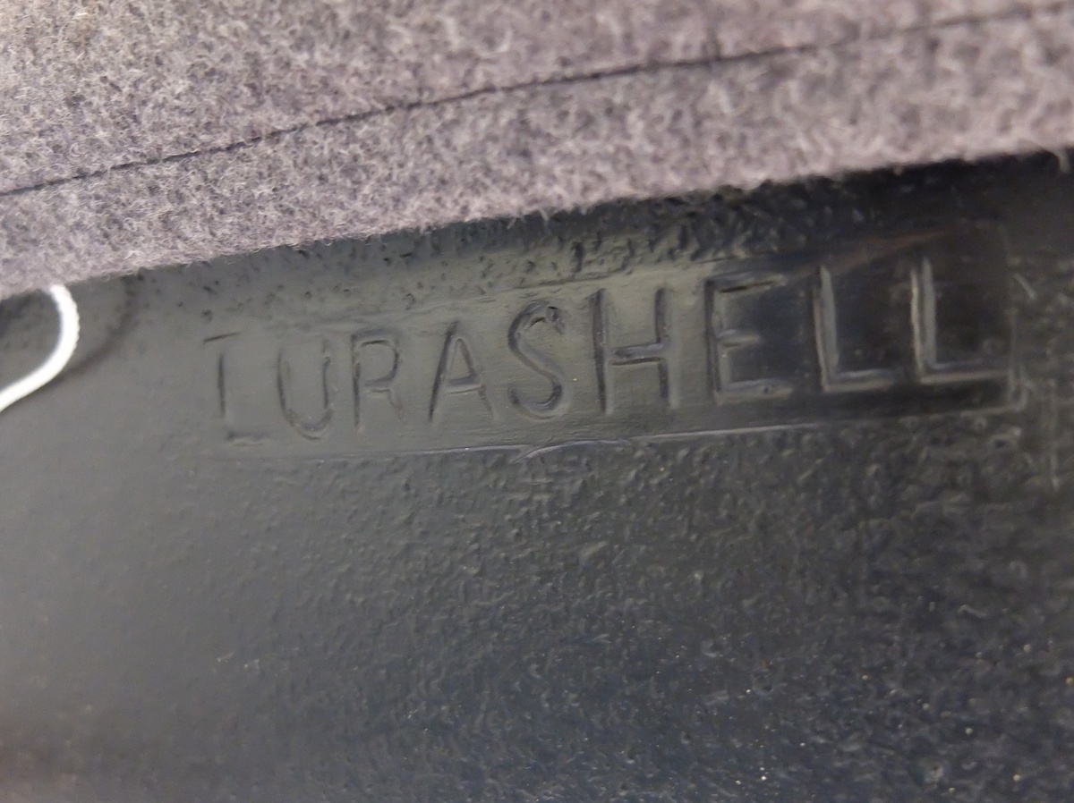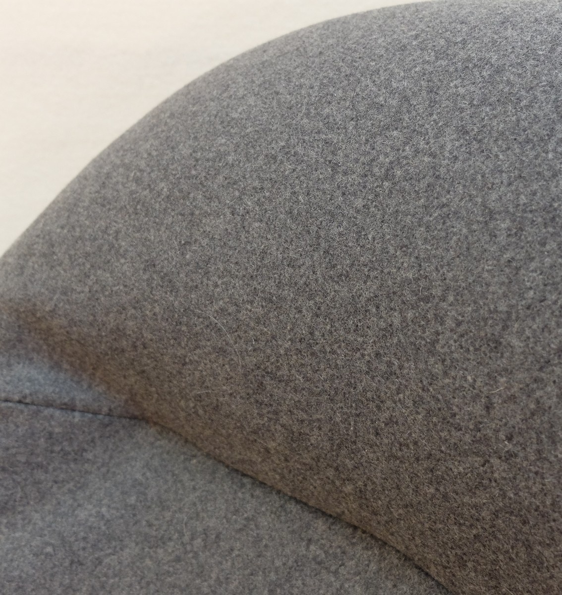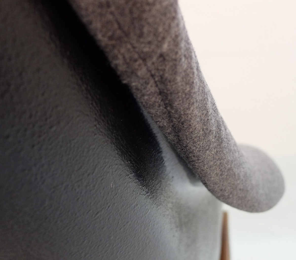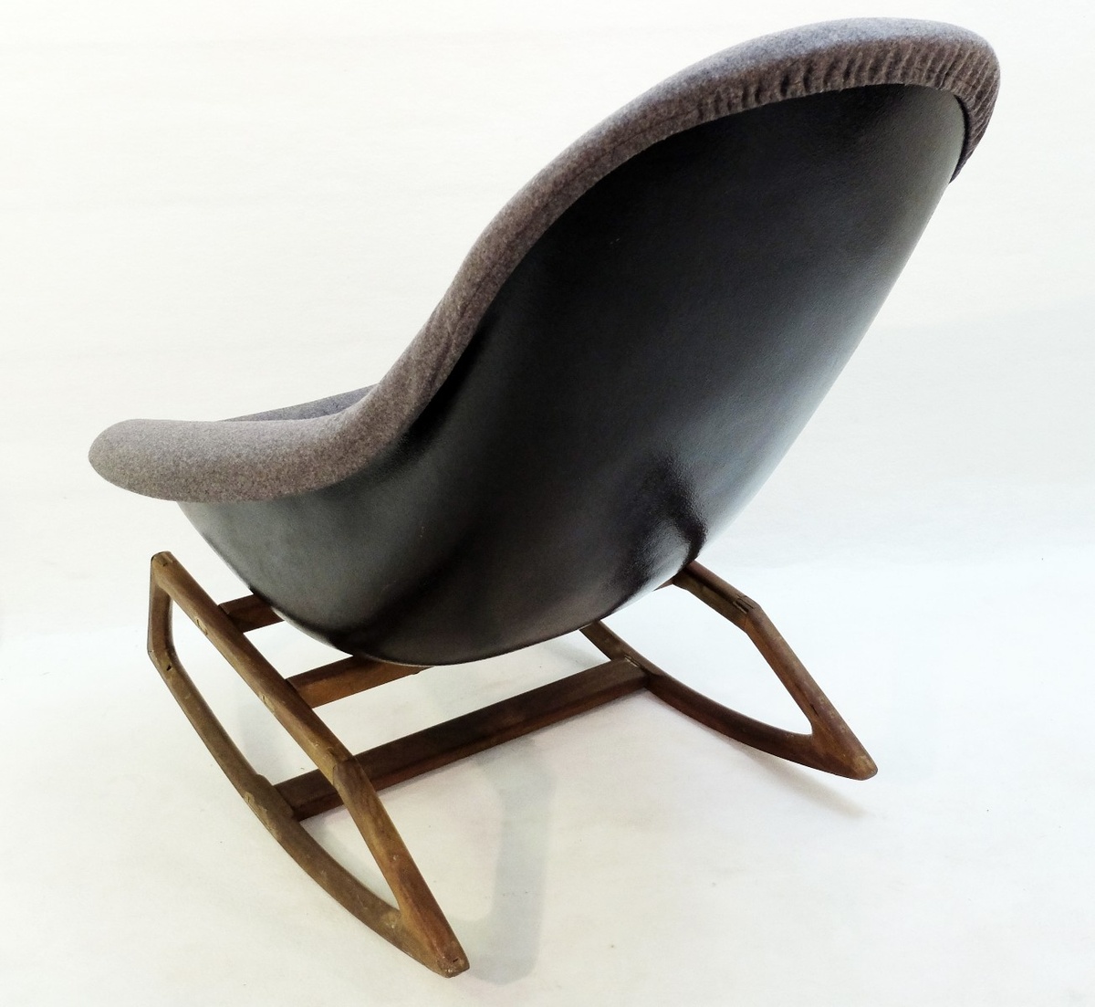 This beautiful 'Gemini' rocking chair was designed by Walter S. Chenery and manufactured by Lurashell in the United Kingdom around 1960.This very comfortable lounge chair has a wonderful organic shaped design. It is upholstered in high-quality gray fabric with a matching, comfortable cushion all held in a black fiberglass shell. The teak base is made with a wonderful eye for detail and provides a nice, smooth rock. The design is most likely inspired by the Gemini star sign, as there are some resemblances in the shapes. All together this creates an exceptional seating comfort to this beautiful, very inviting piece. It is a rare find that will make a beautiful addition to any decor.